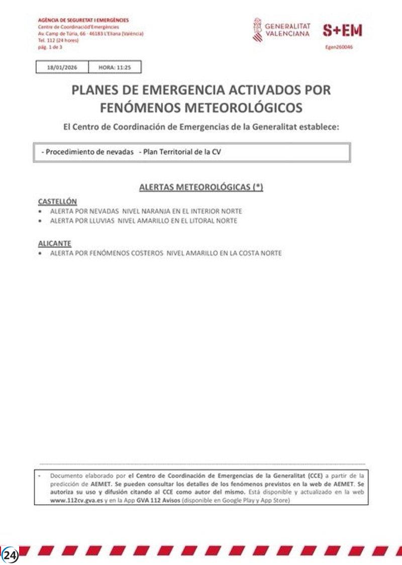 La Generalitat Valenciana ha activado dos niveles de alerta en la provincia de Castellón para mañana. Se trata de una alerta naranja debido a las nevadas previstas en el interior norte, así como una alerta amarilla por lluvias en el litoral norte.