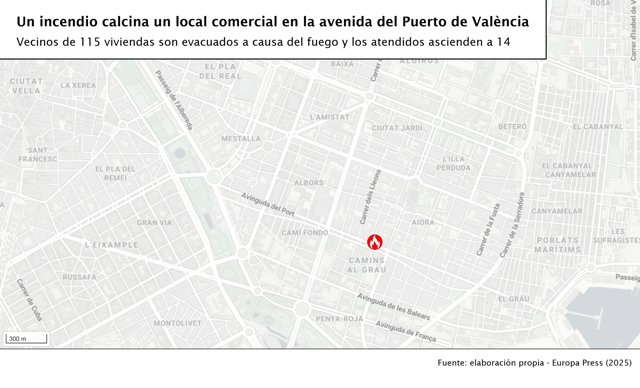 Incendio en local de la avenida del Puerto de València bajo control; 14 personas reciben atención médica.