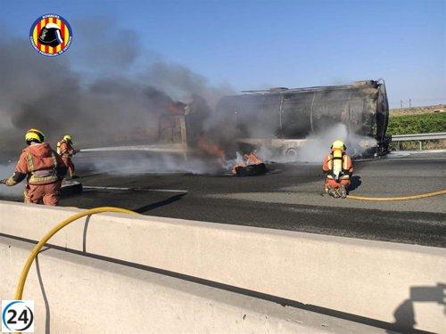 Incendio de camión en la A-7 cerca de Bétera bloquea dos carriles hacia Alicante.