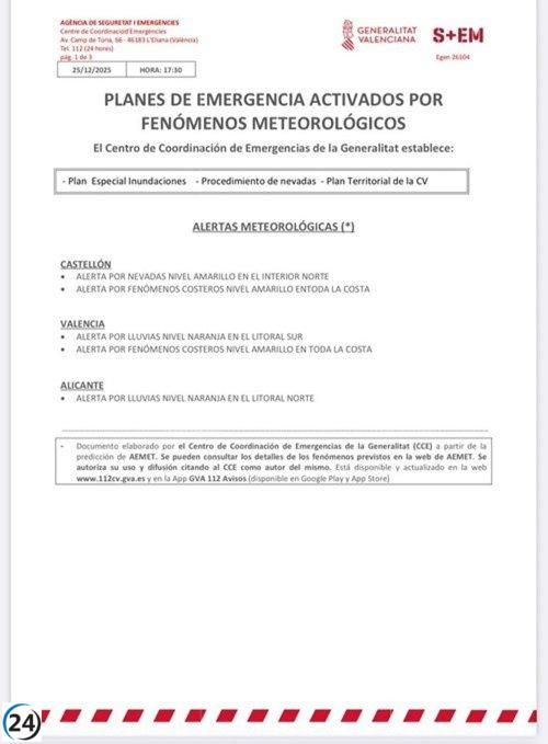 Aumenta la alerta a naranja por lluvias en el norte de Alicante; el sur de Valencia permanece en amarillo.