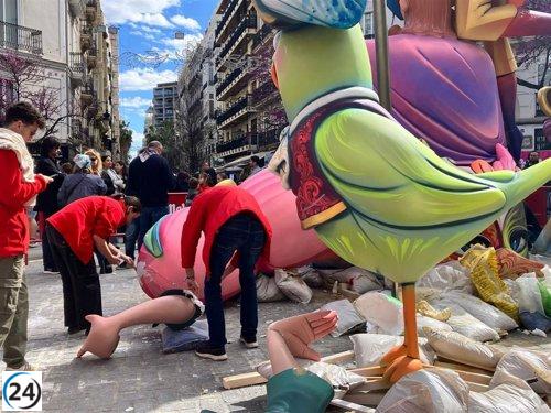 Se desploma un ninot en la falla Félix Pizcueta-Ciril Amorós a causa de la lluvia acumulada.