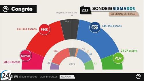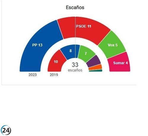 El PP lideraría en la Comunitat con 12-14 diputados, seguido del PSOE con 11-12, Vox con 4 y Sumar con 4-5, según sondeo.
